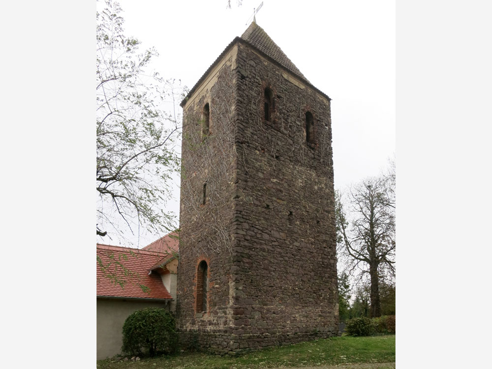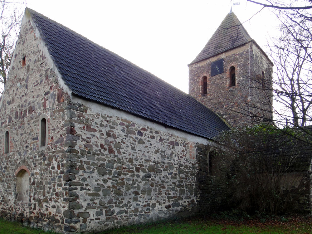 Der ursprüngliche Bau der Saalkirche kann in der Zeit um 1200 oder auch bereits etwas eher entstanden sein. Möglicherweise hatte dieser erste Saalbau eine Länge von nur zehn bis zwölf Metern und schloss mit eingezogenem Chor und Apsis im Osten sowie einem Turm im Westen. Aus dieser Zeit hat sich ein heute vermauertes Fenster im Bereich der ehemaligen Saalnordwand erhalten (Abb. 04).