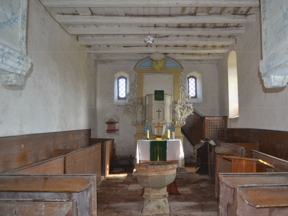 Die Kirche wird über einen Zugang durch den nördlichen Vorraum erschlossen. Den Innenraum prägt zum einen der spätbarocke Kanzelaltar, zum anderen die kurze Hufeisenempore sowie das einfache barocke Kastengestühl (Abb. 03). Der Fußboden besteht aus Sandsteinplatten. Die Decke setzt sich überwiegend aus Eichenholzbalken zusammen. Sechs Fenster belichten den Saal: An der Südfassade drei größere Fenster mit Korbbogenschluss, an der Ostseite (Chorschluss) zwei kleinere Fenster mit flachem Bogensturz und ein Fenster neben der Empore. Das östliche Mauerwerk des Turmes hat eine Rundbogenöffnung zum Saal hin.