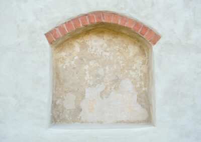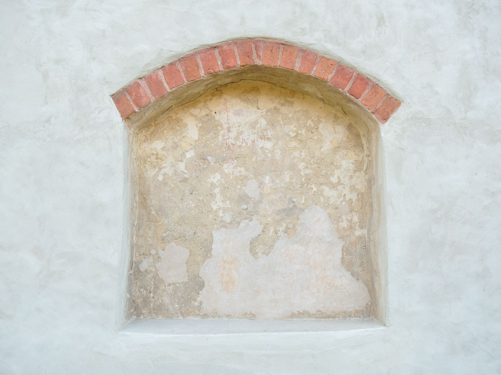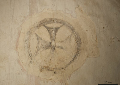 Die Ziegelsteine im Laibungsrandbereich wurden glatt verfugt sowie am Übergang zum Ziegel eine Ritzung eingefügt, mit einer roten Lasur beschichtet bzw. die Laibungs- und Wandflächen gelblich weiß getüncht. Das Weihekreuz wurde mittels eingeritztem Zirkelschlag in den noch frischen Putz angelegt (Abb. 12, 13). Die Binnenflächen erhielten eine rote Fassung, vermutlich mit Mennige oder Zinnober als Rotpigment, die im Zuge der Alterung verschwärzten.