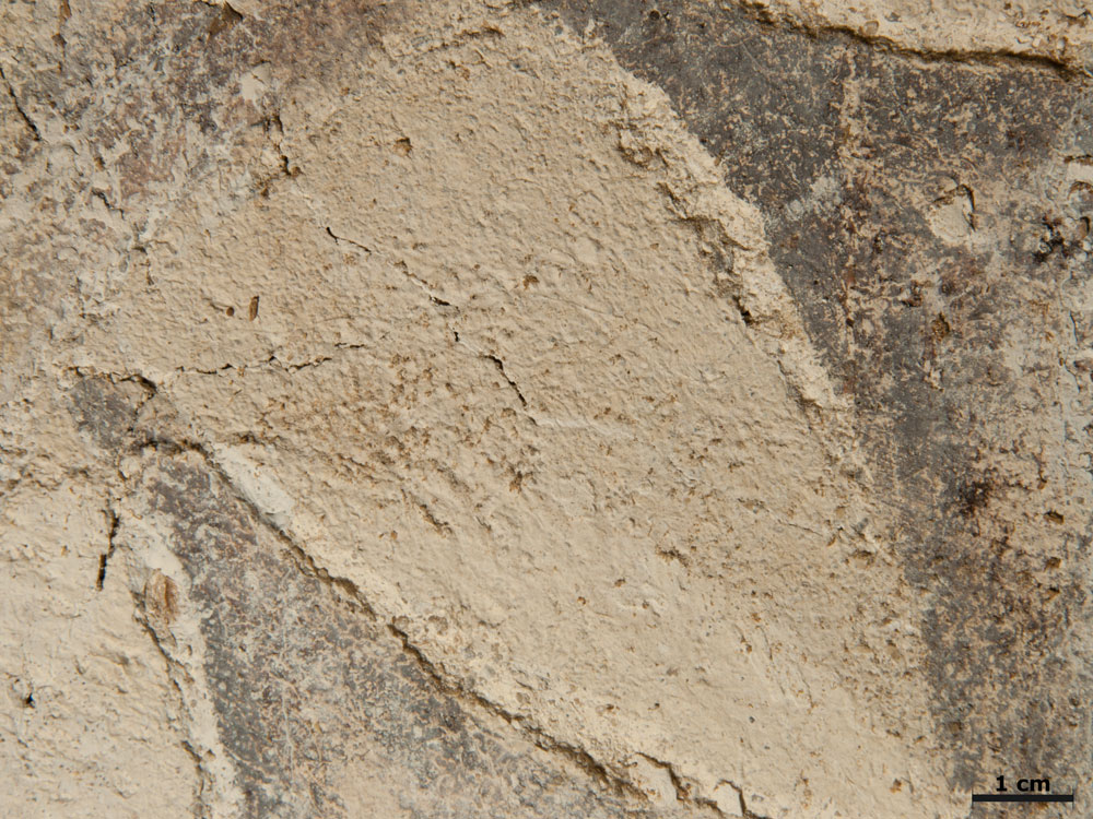 Südwand, Mitte, Detail des oberen linken Randes des Weihekreuzes, Streiflicht. Gut erkennbar sind die noch in frischem Putz erfolgten Ritzungen zur Anlage der Konturen