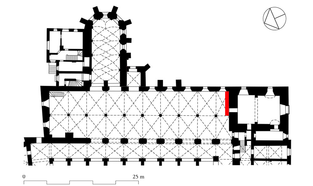 In welchem Umfang Bauteile und Bauabschnitte vom Remter in das 2. Drittel des 13. Jahrhunderts gehören, lässt sich nicht sicher bestimmen. Nach einem Bauschaden soll eine erneute Einwölbung in der Zeit um 1320/1330 stattgefunden haben (Abb. 05). Dabei wurden antike Säulenschäfte aus Oberitalien aus Vorgängerbauten wiederverwendet und als Spolien erneut verbaut.⁴