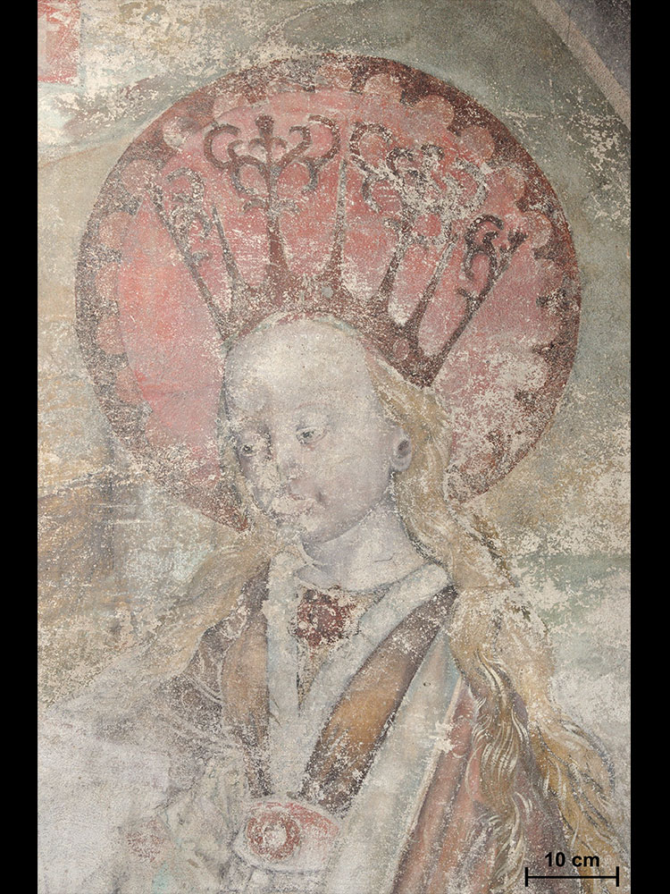 Die Malweise kennzeichnet sich durch einen sehr dünnschichtigen Auftrag mit vielen lasierend gearbeiteten Details. Nur selten treten pastos angelegte lineare Lichter, Konturen und Binnengliederungen auf. Die Schattierungen der Gewänder und Modellierungen der Inkarnate wurden zum Teil sehr feinteilig ausgemischt. Die Wandmalerei erinnert stark an die zeitgenössische Tafelmalerei (Abb. 11, 12).¹³ Als Pigmente wurden Bleiweiß, Bleimennige, Zinnober und Azurit verwendet, die einer für diese Zeit klassischen Palette an hochwertigen Mineralpigmenten entsprechen.¹⁴