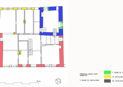 Die nachstehend beschriebenen Gestaltungselemente haben sich an der Nord- und Westwand des großen straßenseitigen Erdgeschossraums erhalten, der ehemals wohl mit Wandöffnungen (Wandschrank, Wandnische, Kamin) repräsentativ ausgestattet war (Abb. 04).