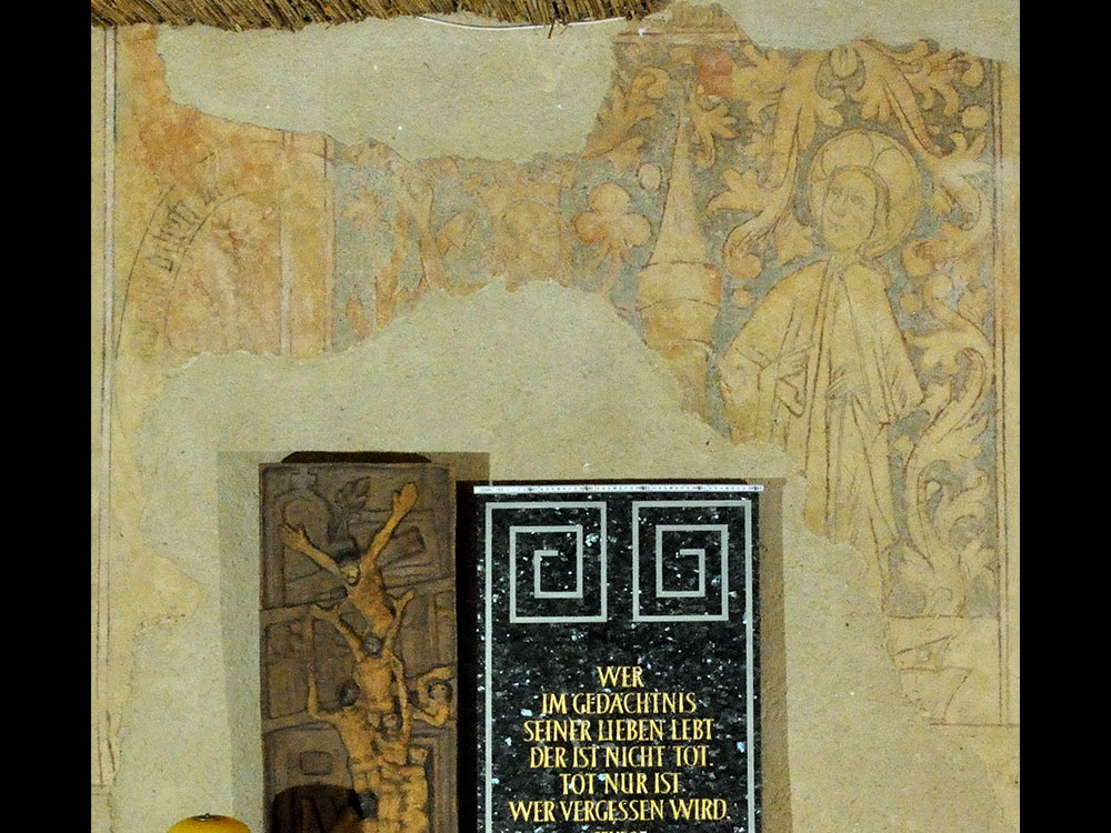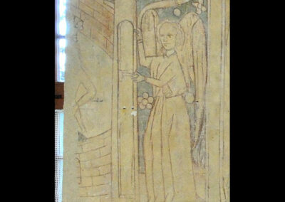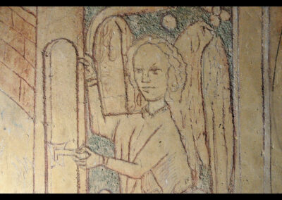 Von der westlichsten Darstellung hat sich nur die rechte Bildhälfte erhalten. Sie zeigt einen stehenden Engel mit einem Schlüssel, der die Pforte eines Mauerturms öffnet und mit seiner rechten Hand das Ende eines geschwungenen Schriftbandes hält. Fünfblättrige Blüten um ihn deuten eine Gartenlandschaft an. Doch befindet sich der eigentliche hortus conclusus innerhalb des Mauerrings. Dieser umschlossene Garten dient als Symbol für die Reinheit der Jungfrau Maria (Hoheslied 4,12).⁹ Links inmitten des Mauerrings ist in der verlorenen Bildmitte die bekrönte Maria, die jungfräuliche Mutter Christi, zu vermuten, von der sich nur der linke Arm und ein Teil der Krone erhalten haben. Nur unter dem westlichen Bildfeld blieb der untere Abschluss aus einem breiten Ornamentband mit einer Akanthusranke bestehen.¹⁰