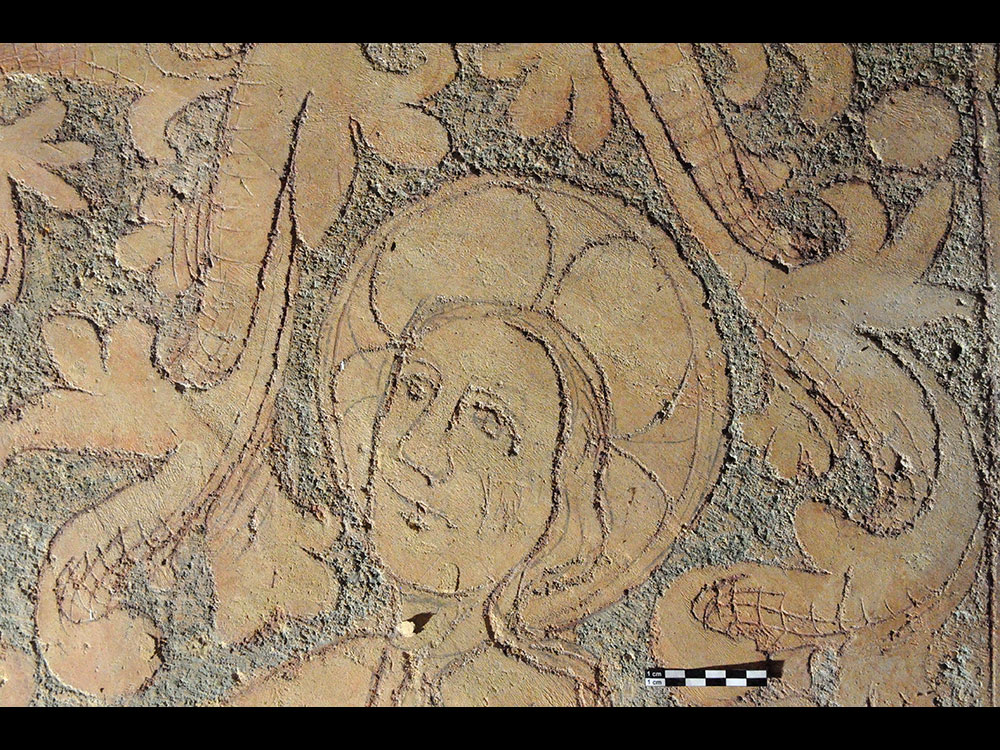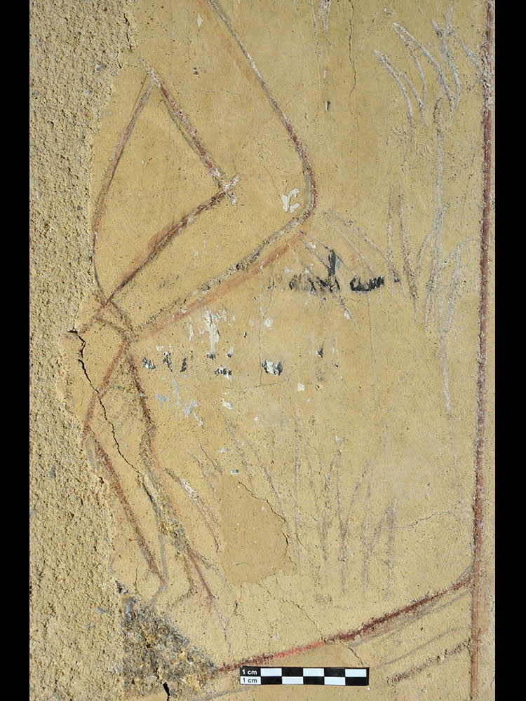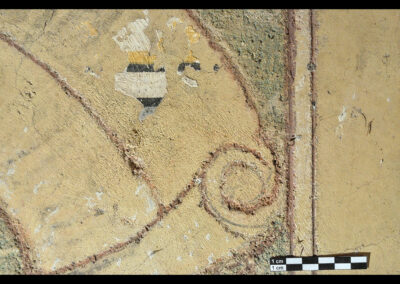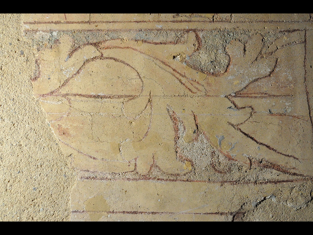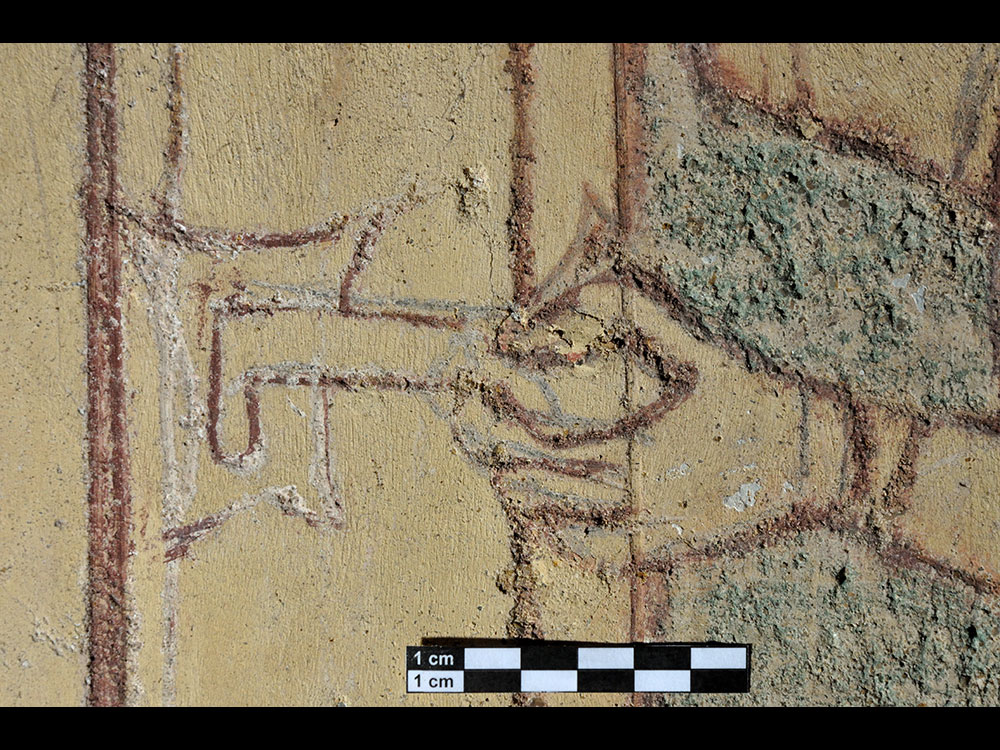 Detail des Schlüssels in Abb. 07 mit grauschwarzen Vorzeichnungen, die teils flache Rillen und teils Ritzungen erzeugt haben sowie eine senkrechte Angabe der Außenkante der Architektur, die durch die Hand verläuft und frisch in den Putz eingearbeitet wurde (weiche Kanten). Die spätere Kontur deckt sich häufig nicht mit der Vorzeichnung