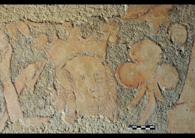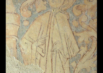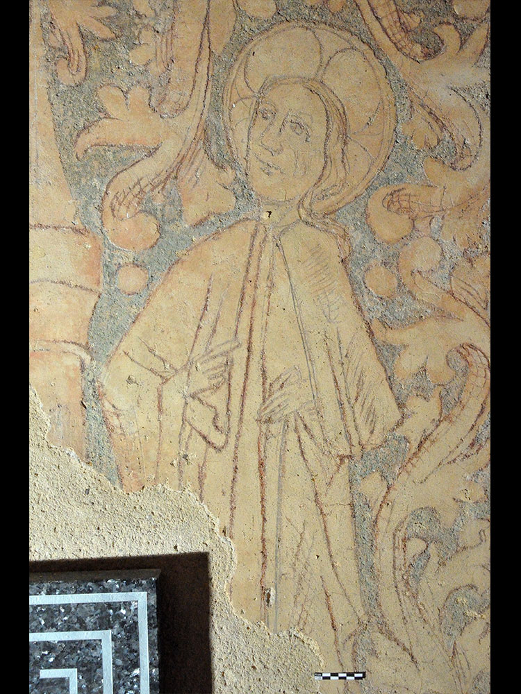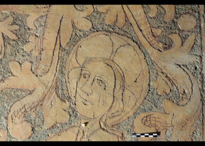 Als Verputz diente ein vermutlich latent hydraulischer Kalkputz mit hoher innerer Festigkeit bei gleichzeitiger geringer Bindung. Er wurde im Bereich der Nordwand in drei horizontalen Putzportionen aufgetragen und eingeglättet (Abb. 17). Für die erste Anlage der Komposition wurde eine Vorzeichnung mit einem Kohlestift erstellt (Abb. 18, 19). Diese hinterließ teils feine Rillen. Anschließend erfolgte die Anlage der Konturen durch stärkeres Einritzen in den Putz. Die Hintergründe wurden großflächig aufgeraut (Abb. 20, 21). In beiden Fällen kommt es zu deutlichen Abweichungen von den Vorgaben der Vorzeichnung (Abb. 22, 23).