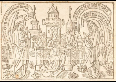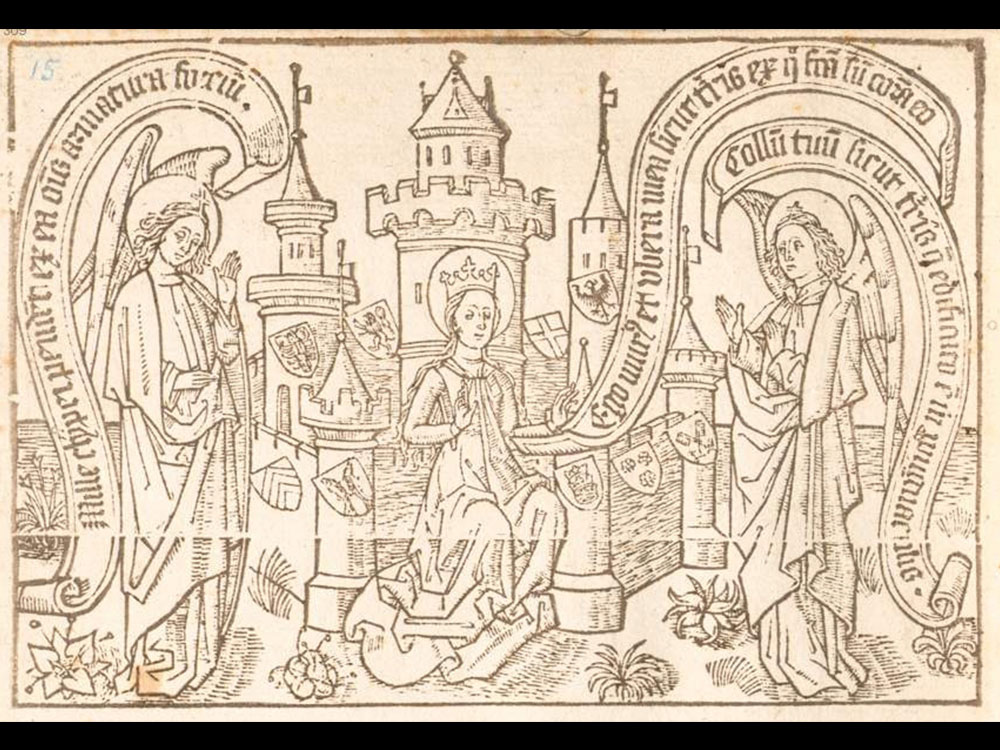 Bei der Ausmalung im Salzelmener Terminierhaus hat man sich für ein selten ausgesuchtes Thema entschieden, das dem alttestamentlichen Hohen Lied König Salomons entnommen ist. Dieses ist, wenn man dem Bibeltext genau folgt, ist ein Liebeslied, das aber auch auf Maria umgedeutet werden kann. Zahlreiche mariologische Motive wie der hortus conclusus finden sich in der Blockbuch-Vorlage Canticum Canticorum, in der einzelne Verse des Hohenliedes sich teilweise durcheinander verbildlicht aneinanderreihen (Abb. 14).¹⁴ Ob neben den drei verwendeten Bildvorlagen ehemals noch weitere Abbildungen vorhanden waren, und warum man gerade diese Motive verwendet hat, lässt sich nicht mehr klären.