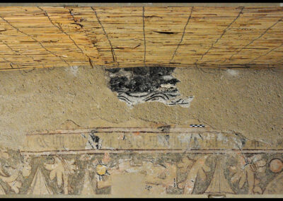 Die Fassung der Oberflächen erfolgte in einer Mischtechnik. Zu den freskal eingebundenen Abschnitten zählt z.B. das schwarze Schriftband (Abb. 16, 21). Bei der farbigen Ausgestaltung der übrigen Dekoration kam, nach Analysen im Jahr 2000 entsprechend, wohl Kalk mit Zusatz eines proteinischen Bindemittels zum Einsatz. Hierbei wurden die optisch vorn liegenden Bereiche mit rotem Ocker in unterschiedlichen Schattierungen und die Hintergründe mit Azurit in hellem Blau (heute zu Grün umgewandelt) gestaltet (Abb. 20). Auf den Rahmungen der Bildfelder fanden sich außerdem orangerote Begleitstriche aus Mennige auf einer weißen Grundierung. Als letzter Arbeitsschritt wurden die Konturen und Teile der Binnenzeichnungen mit einem hämatithaltigen Dunkelrot nachgezogen (Abb. 19-21).¹⁷