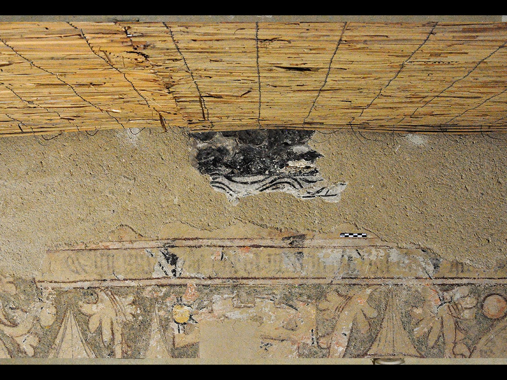 Detail des Schriftbandes in Abb. 07 mit freskal eingebundenen Schriftzeichen sowie deutlich abweichenden Konturen und Binnengliederungen bei der Erstellung der Vorzeichnung und der abschließenden Ausführung der Darstellung