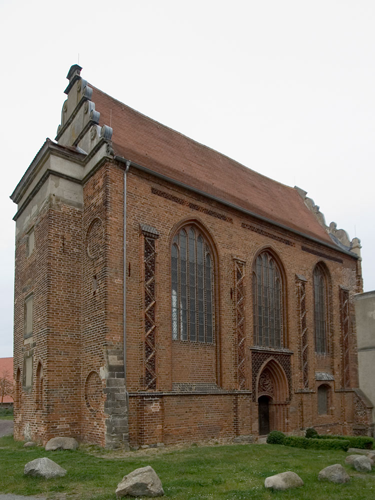 Die Schlosskapelle ist in ihrem Grundriss ein rechteckiger Bau, der unter Einbeziehung der inneren Ringmauer der Oberburg im letzten Drittel des 15. Jahrhunderts entstanden ist (Abb. 01). Sie hat eine Größe von 22,5 m x 10 m, ist in drei Joche untergliedert und wurde fast vollständig aus Backstein errichtet (Abb. 02).
