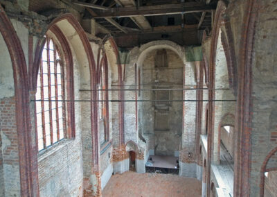 Der helle einschiffige Saal wird in seiner Erscheinung durch die großen Fenster und zahlreiche Nischen geprägt. Oberhalb dieser Wandnischen gibt es Laufgänge, die entlang der Umfassungswände innen vorgelegt worden sind und durch Treppen erreicht werden können (Abb. 03). Die Strebepfeiler befinden sich an der Innenseite der Längswände. Sie sind im Erdgeschoss durch gewölbte Nischen miteinander verbunden. Von den Pfeilern aus überspannten einst Kreuzrippengewölbe die Kapelle, deren Gewölbeanfänger in Resten noch vorhanden sind. Die Gewölbe sind wohl Ende des 18. Jahrhunderts aufgrund statischer Schwierigkeiten zurückgebaut worden.