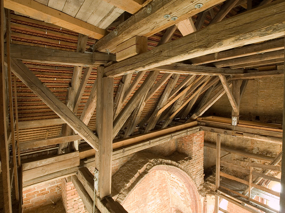 Die als Kehlbalkendach konzipierte Dachkonstruktion mit doppelt stehendem Stuhl und Kreuzverstrebung gehört zum Ursprungsbau, wurde aber mehrfach repariert (Abb. 04).