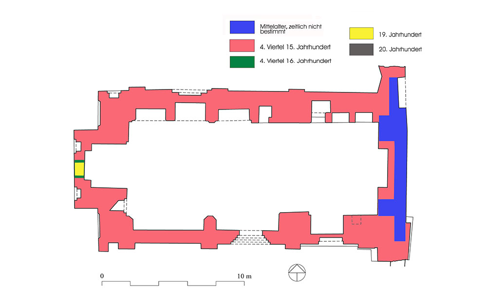 Baualtersplan der Schlosskapelle (Plangrundlage: Archivbestand des Landesamtes für Denkmalpflege und Archäologie Sachsen-Anhalt, bearbeitet durch Karlson 2020)