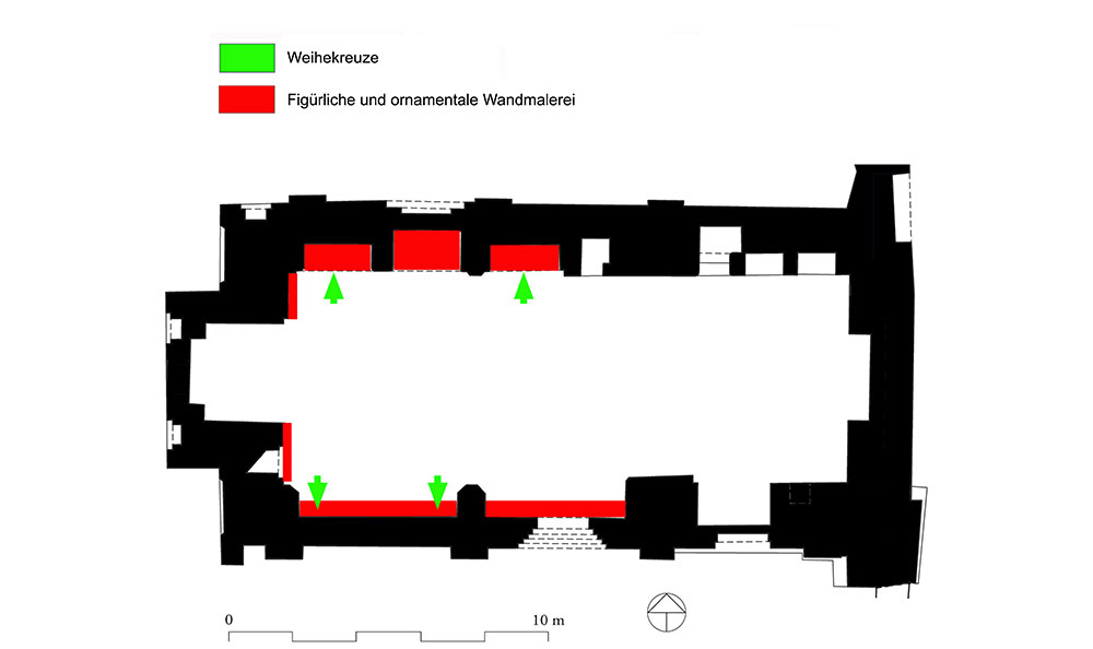 In diese noch frische Kalktünche wurden die Weihekreuze über Ritzungen mit einem Zirkel konstruiert (Abb. 15). Die Binnenfläche wurde Rot gefüllt. Sie wurden bis auf eine Ausnahme über dem südlichen Eingang von der nachfolgenden figürlichen Gestaltung ausgespart oder wurden in diese einbezogen.