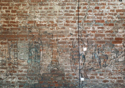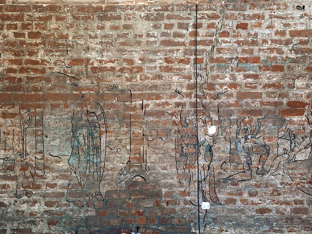 Ansicht auf die Südwand des mittleren Jochs mit der von Dipl.-Rest. Anja Romanowski 2004 erstellten Umzeichnung (schwarze Konturierung). Dargestellt sind fünf nicht mehr genau zu identifizierende Figuren