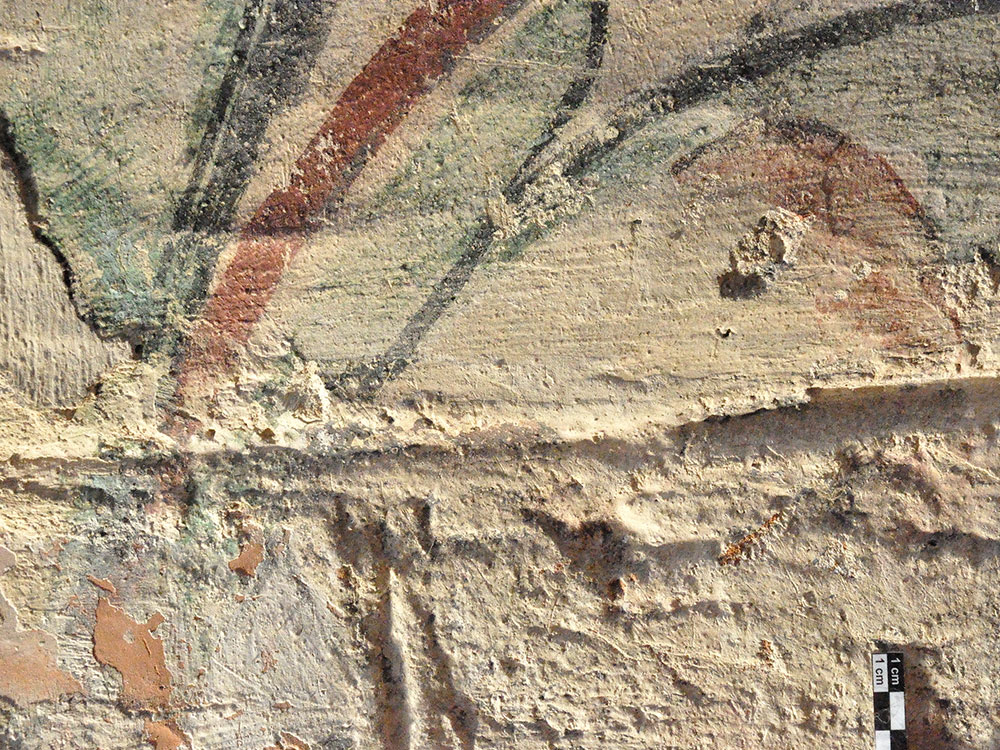 Romanowski attestiert den Malereien 2009 eine ehemals starke Lokalfarbigkeit, die auf der Verwendung sehr farbintensiver Pigmente wie Azurit, Malachit, Blei-Zinn-Gelb, Zinnober und Mennige basiere.²³ Darüber hinaus kamen gedecktere Farben durch die Verwendung roter und gelber Ocker, Pflanzenschwarz und Calciumcarbonat als Weißpigment zum Einsatz. Teilweise wurde die Farbwirkung durch Auftrag verschieden farbiger Schichten gesteuert. Plastizitäten wurden durch unterschiedliche grafische und malerische Methoden erzeugt (Abb. 10, 11, 16, 17). Das Bindemittel der Malerei konnte bislang analytisch nicht eindeutig nachgewiesen werden. Singulär steht der Nachweis eines gewissen Anteils an Protein. Eine Ausführung in Secco-Technik unter Verwendung organischer Bindemittel wie in der Temperamalerei liege laut Romanowski phänomenologisch jedoch nahe.²⁴